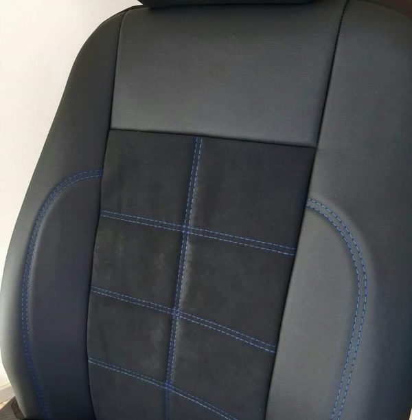 Coprisedili in ecopelle automobilistica nera di alta qualità e al centro con fascia alta alcantara traforata nera con filo bianco.